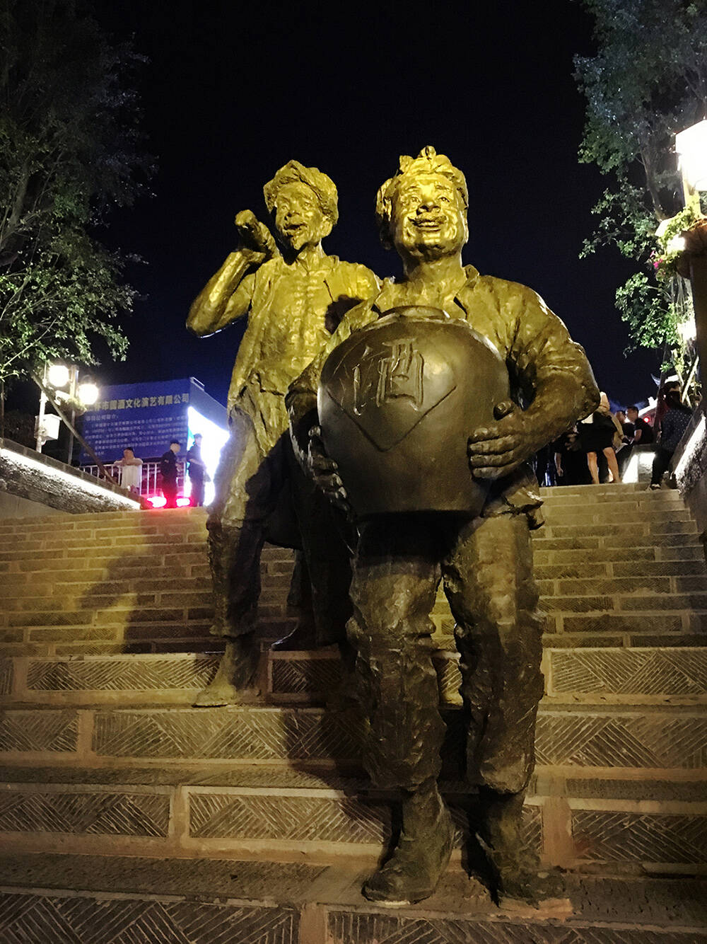 “酒”的元素在茅台镇随处可见,抱着酒坛的茅台人雕塑拾级而下。