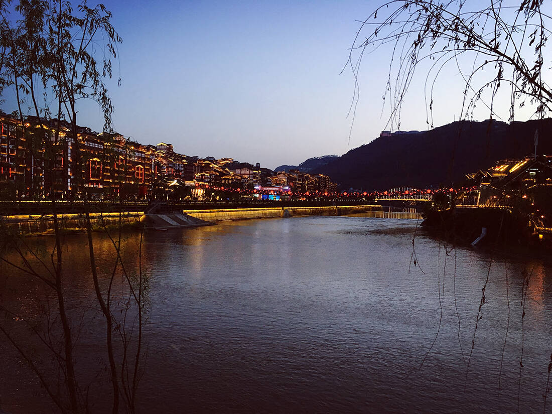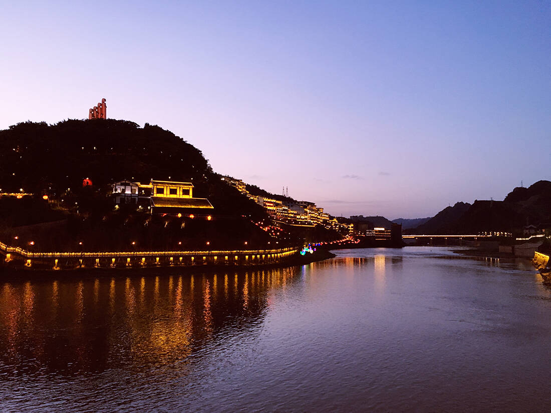 傍晚的赤水河倒影着青山和茅台镇。