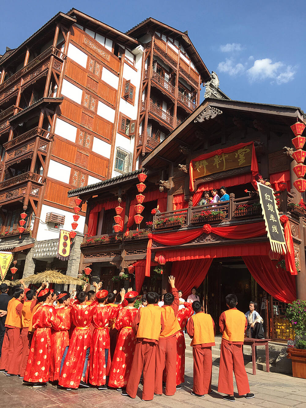 身着古衣的茅台镇人,在杨柳湾街表演“抛绣球”。